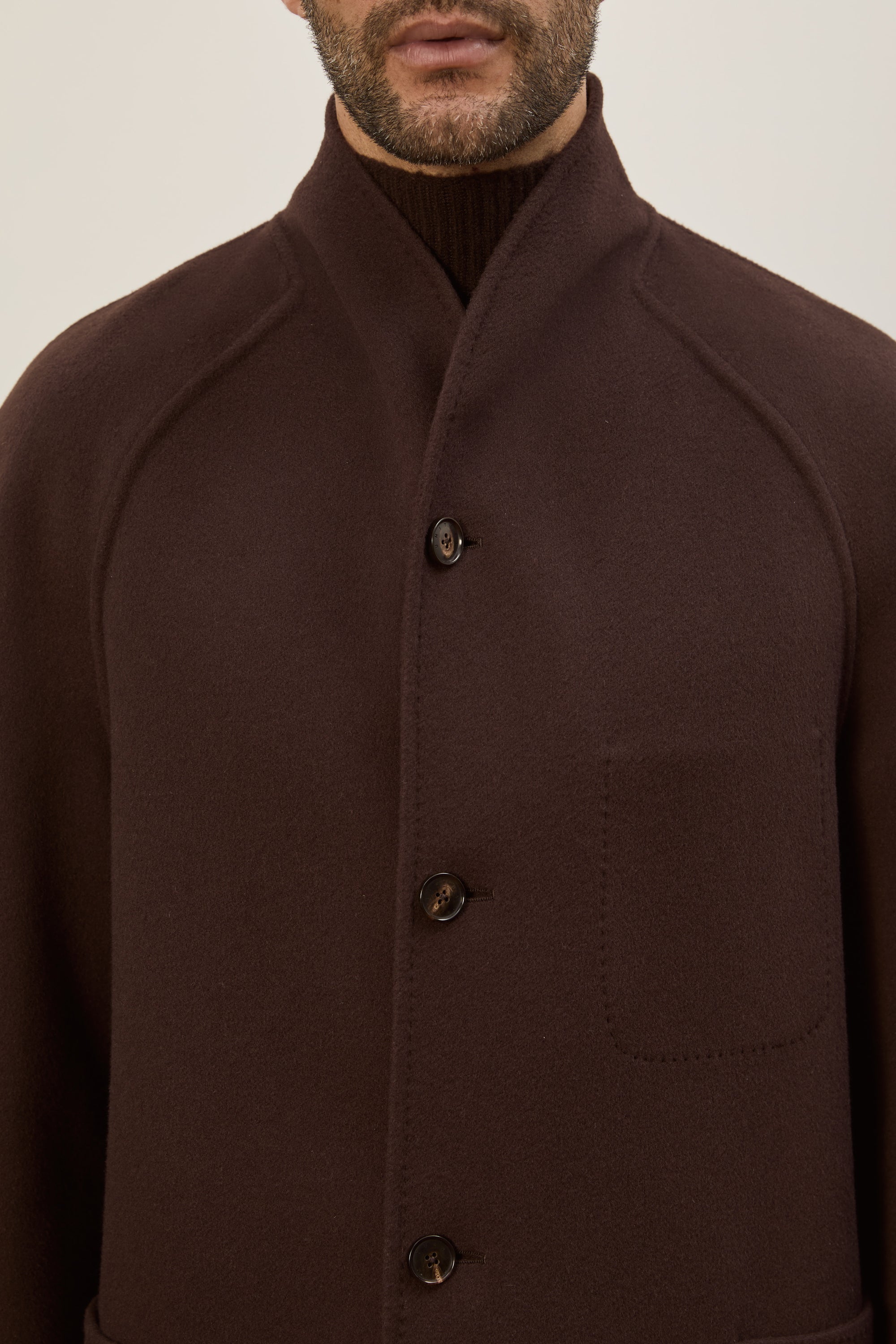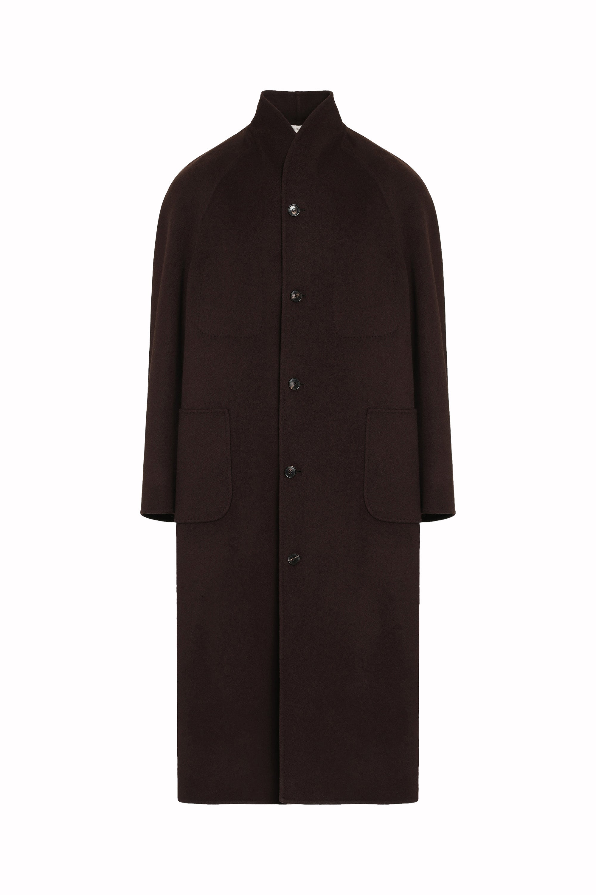 Blending modern minimalism with timeless elegance, this Caan Coat subtly stands out with its upright shawl collar, raglan sleeves, and roomy patch pockets. It's tailored from double-faced cashmere in a comfortable, unstructured profile, finished with traditional horn buttons – a hallmark of quality and taste.