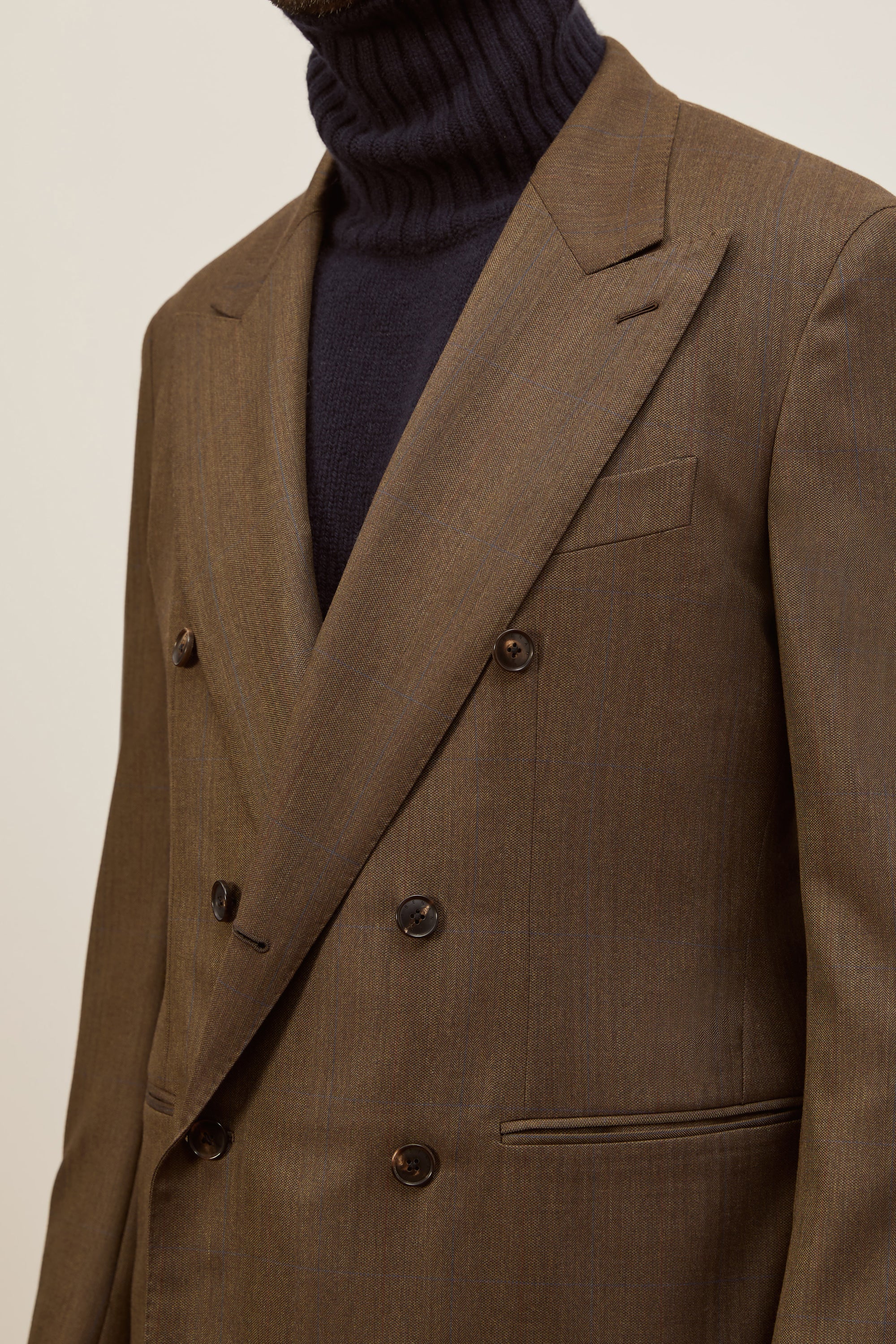 Made with the finest Italian skill and craftsmanship, this six button double-breasted blazer is tailored from lightweight wool . The meticulously selected fabric drapes smoothly, enhancing the defined silhouette while preserving the natural elegance of the human form. Subtle Neapolitan shoulders add a touch of traditional refinement, while the horn button closure enhance the design with understated sophistication.